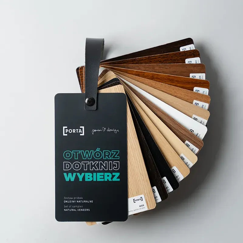 Zestaw próbek oklein naturalnych. W skład próbnika wchodzą próbki o wymiarach 80x140 mm, spięte w formę poręcznego i łatwego do codziennej pracy wachlarzyka.