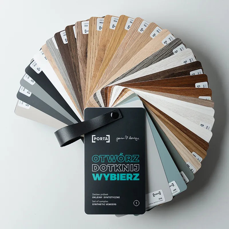 Zestaw próbek oklein syntetycznych. W skład próbnika wchodzą próbki o wymiarach 80x140 mm, spięte w formę poręcznego i łatwego do codziennej pracy wachlarzyka.
